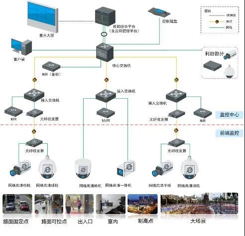 監控中心部分:監控中心采用磁盤陣列存儲服務器將高清視頻圖像進行存儲,解決數據落地問題;配置視頻綜合平臺,完成視頻的解碼解碼、拼接;監控中心部署LCD大屏用來將視頻進行上墻顯示等。系統可將模擬攝像機、網絡攝像機和數字攝像機都接入到視頻綜合平臺,實現統一的管理平臺、統一的切換控制系統和統一的顯示系統,實現對整個系統的統一配置和管理。