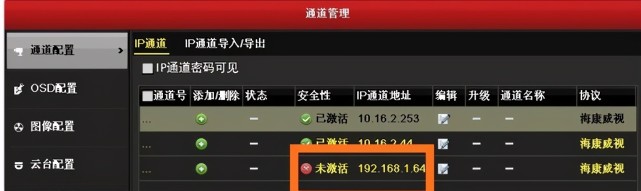 通常情況下,新裝的攝像機通道添加時需要激活設備,在錄像主機主菜單-通道管理-通道配置- IP通道,單擊未激活的IP攝像機或選擇“一鍵激活”所有的設備,彈出激活界面,創建密碼即可正常添加設備,未激活的設備無法正常顯示監控畫面。